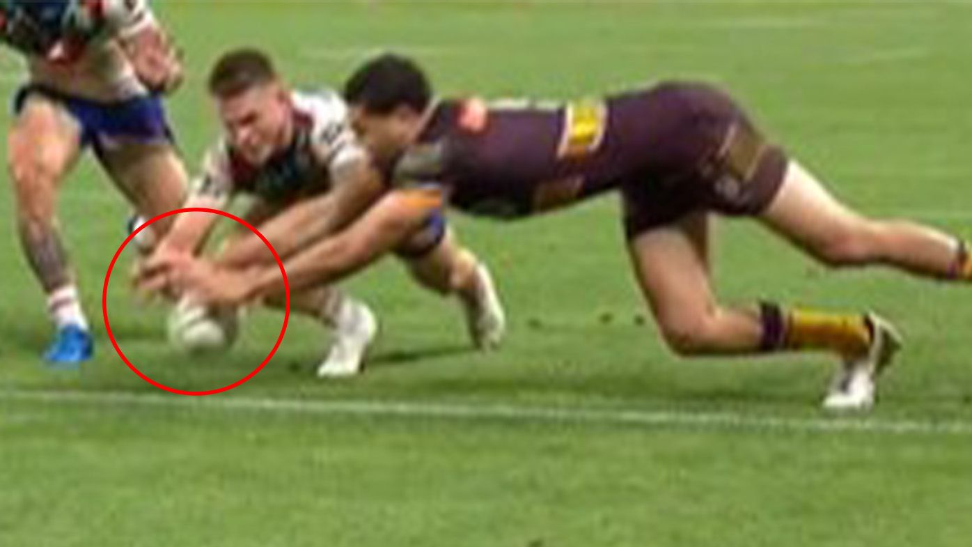 Warriors whizkid reece walsh put a deft grubber behind the brisbane defence and his teammate euan aitken dived on it, at the same time broncos winger xavier coates did.